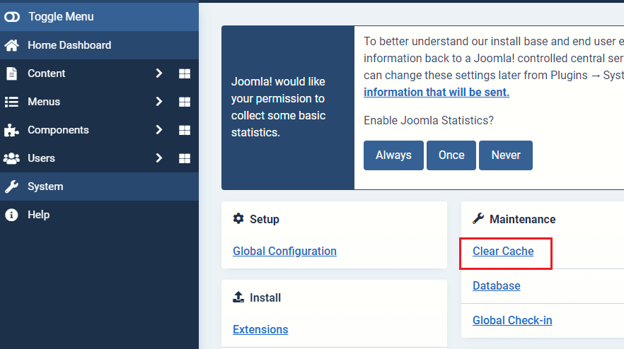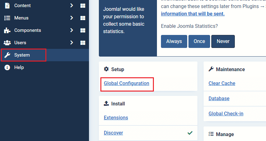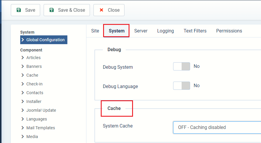 ابتدا باید حافظه پنهان را در جوملا فعال کرده و سپس پیکربندی های مختلف آن را ادامه دهیم. برای فعال کردن حافظه پنهان در جوملا ، ابتدا وارد پنل مدیریت خود شوید و سپس به مسیر مربوط به آن بروید :