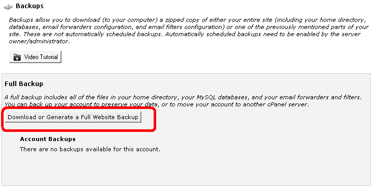 برای تهیه نسخه کامل از سایت خود که شامل تمام فایلها ، محتویات و اطلاعات سایت شما می باشد در قسمت Full Backup بر روی گزینه Download or Generate a Full Website Backupکلیک کنید .